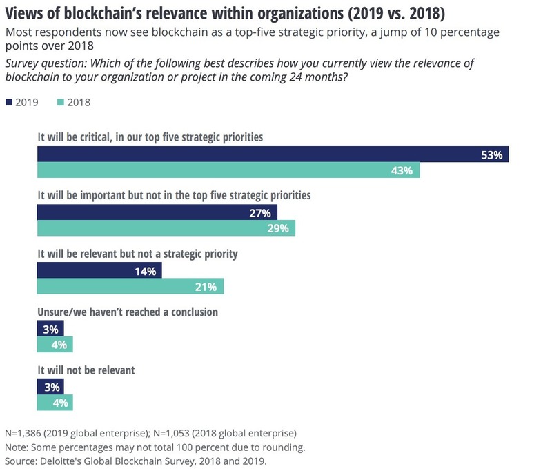 The recent Deloittes 2019 Global Blockchain surevy found that most respondents now see blockchain as a top-five strategic priority, a jump of 10% from 2018.